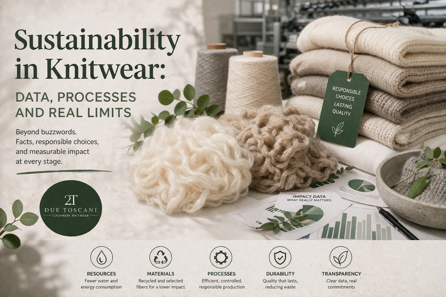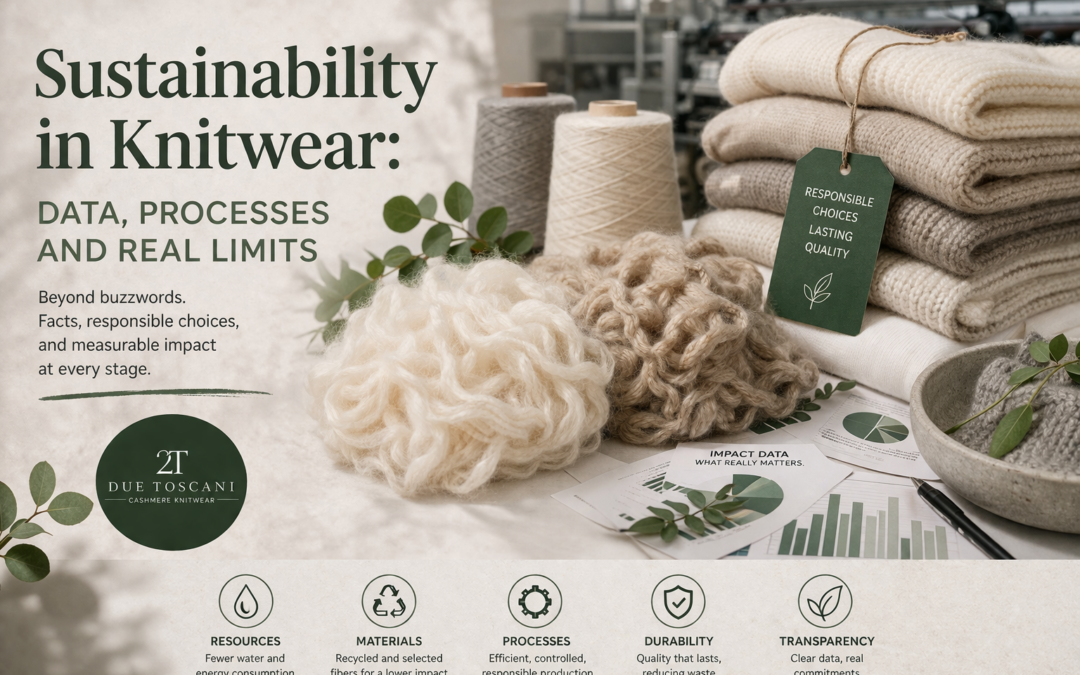 In the textile and knitwear industry, the word “sustainability” has become omnipresent, often used more as a commercial lever than as a true description of a real process. For a B2B client – buyer, brand, or design office – navigating this landscape means distinguishing between claims and facts, between marketing and production. Sustainability, when it is concrete, is not a slogan but a system of technical, industrial, and economic choices that run throughout the entire supply chain.